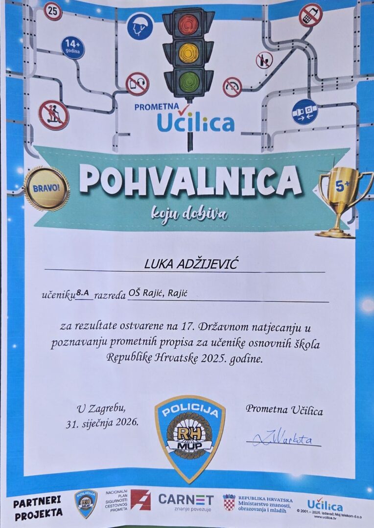 Naš učenik Luka Adžijević (8.A) ostvario je izvrstan rezultat na 17. Državnom natjecanju u poznavanju prometnih propisa za učenike osnovnih škola Republike Hrvatske za 2025. godinu.