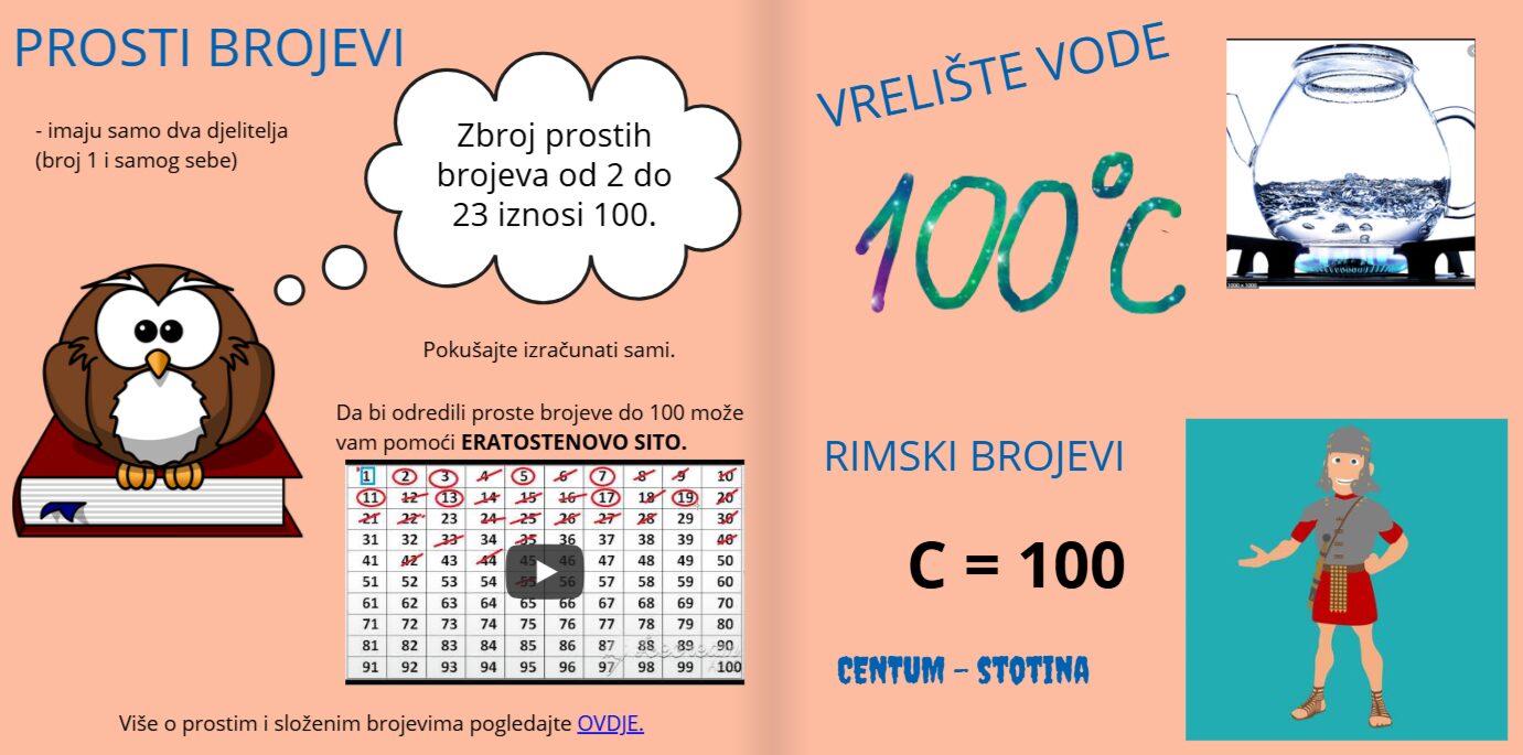 Zanimljivosti o broju 100 možete vidjeti u knjizi na poveznici https://read.bookcreator.com/aenOe3HWn8i0AYuxY50iO4ElE0gtMhyDFH0YBDpdys4/sA8TKlTGS2iCfjsGZEHw1w